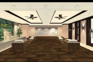 エントランスホールは、淡い色味の中で緑色の大理石の壁がアクセントとなり高級感あふれる空間となっております。正面には、バリ現地の職人が手彫りして製作したストーンカービングを設置し、ソファセットと相まってリゾートホテルのような空間を演出しています。
